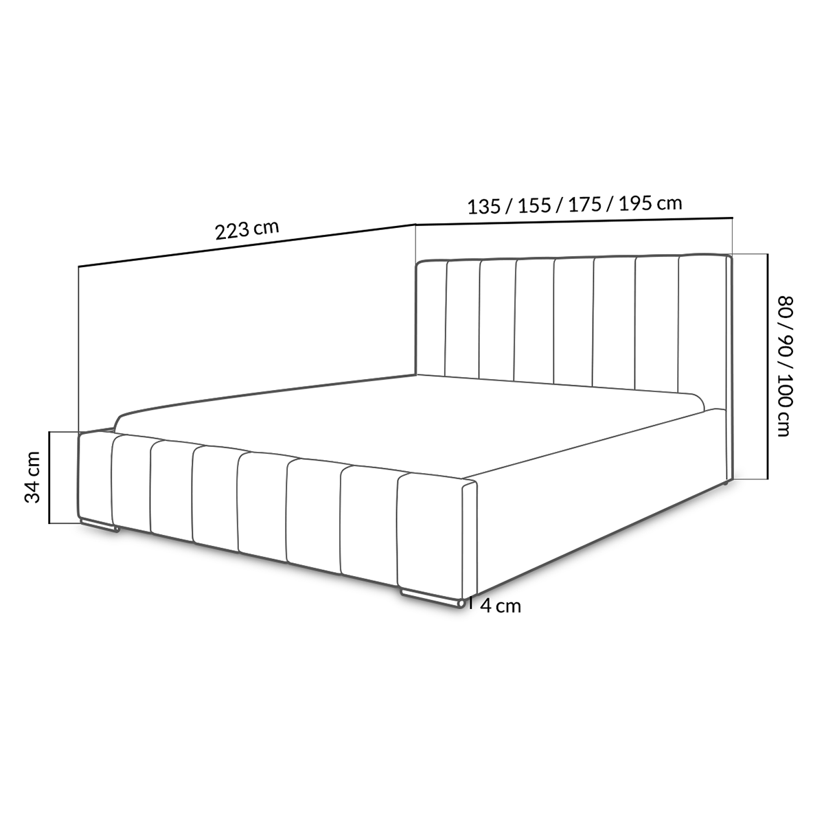 Podstawowa wersja łóżka obejmuje Wysokość zagłówka: 90 cm Stelaż: Rolowany Brak pojemnika na pościel Kolor tapicerki: Royal Velvet 29800 (odcienie beżu) Brak materaca w zestawie
